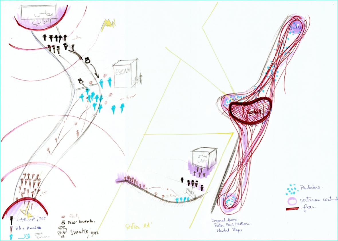 Marianne frames her understanding of the October 2019 in her poster through the lens of sectarianism and its impact on Lebanon society. Marianne explains sectarianism imposes its rule through the fear of the other. Inspired by Peter Gould’s mental map, Marianne reinvents the coast of Lebanon and Beirut with the Lebanese mentality of sectarianism. Red lines represent fear and the starting point of it is a system of sectarian control.